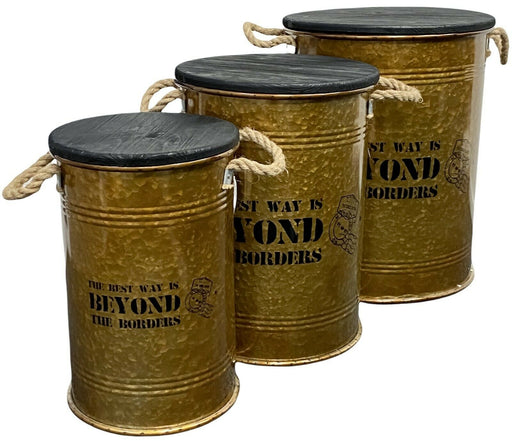 Set of 3 Large Metal Retro Storage Container Bronze Wooden Lids Can Sit On